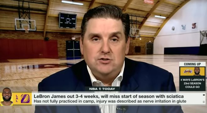 Shams在节目中表示,詹姆斯的伤病“首次出现于7月末至8月初的一次球场训练期间”。他还提到,受此伤病影响,在9月30日训练营开启前,詹姆斯“已有一个多月未进行太多篮球相关训练”。